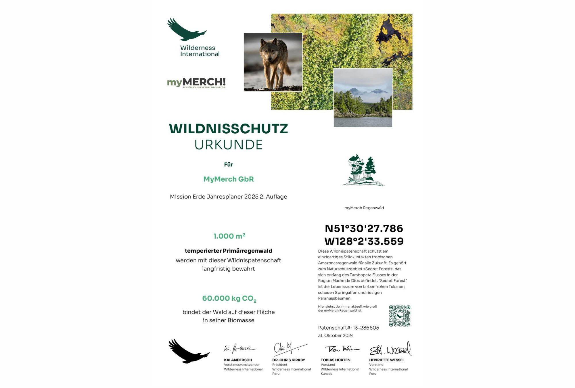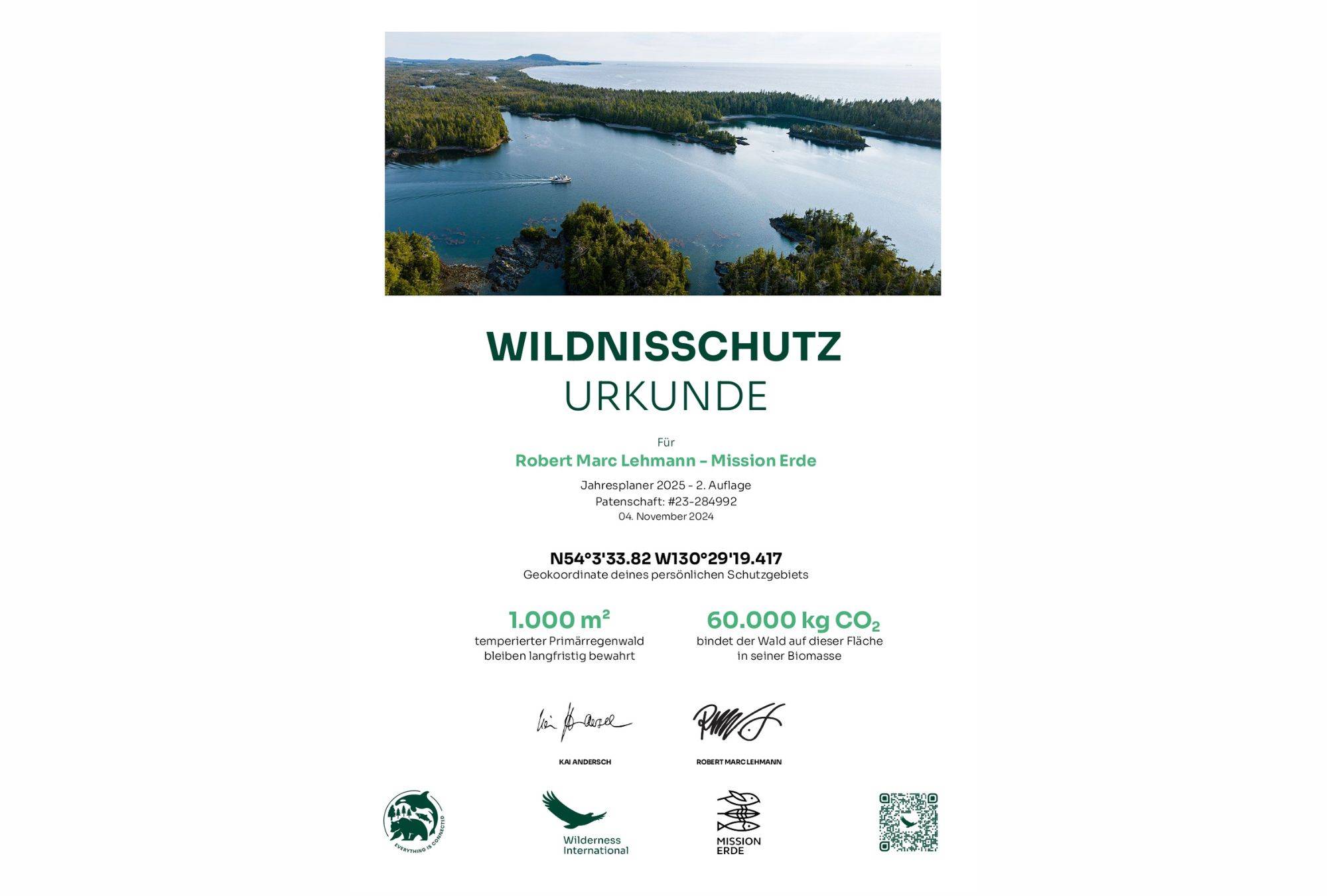 El planificador anual contiene un código QR con el que puedes ver directamente la superficie forestal protegida por ti y por muchos otros. A continuación puede descargar los certificados de la edición correspondiente.