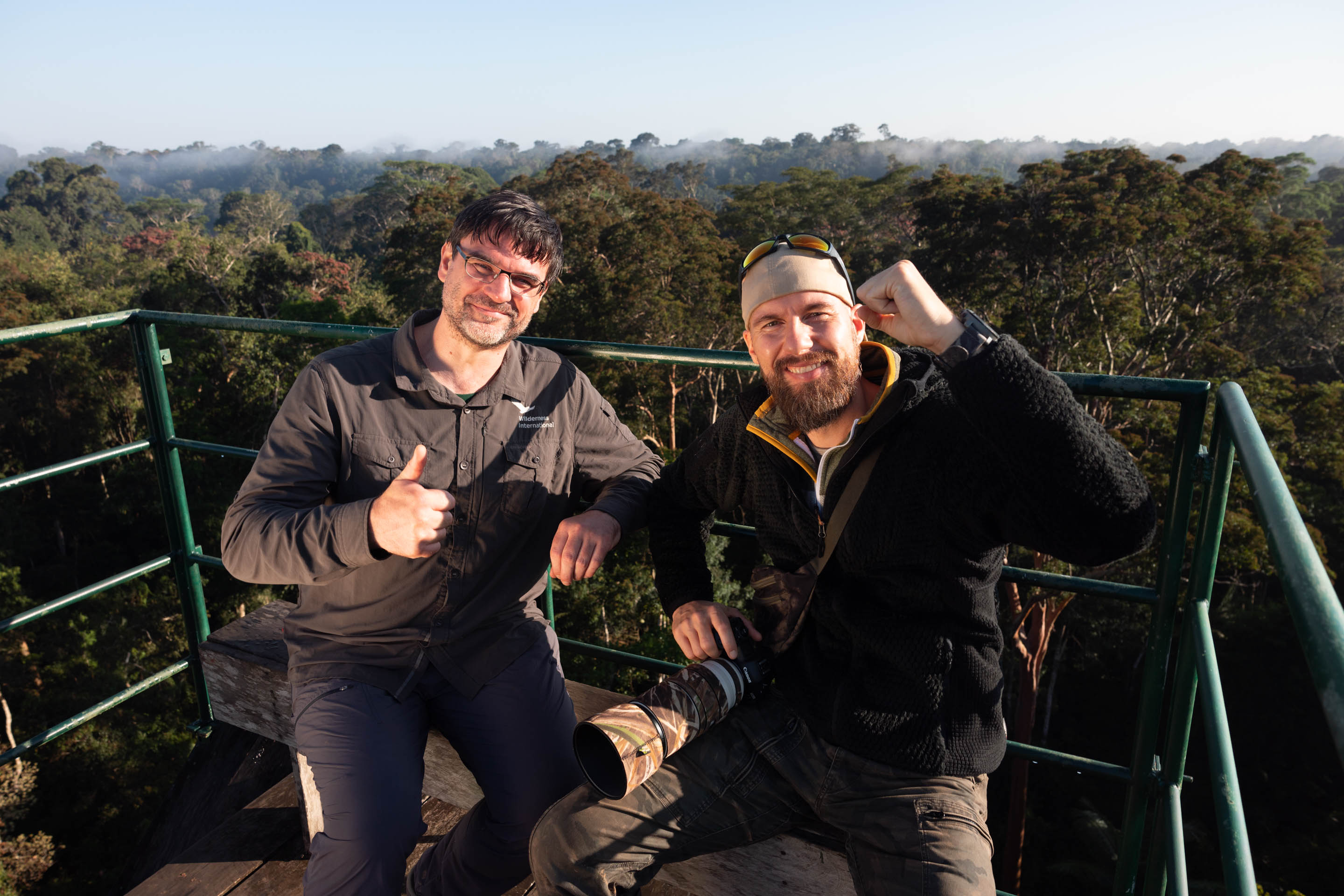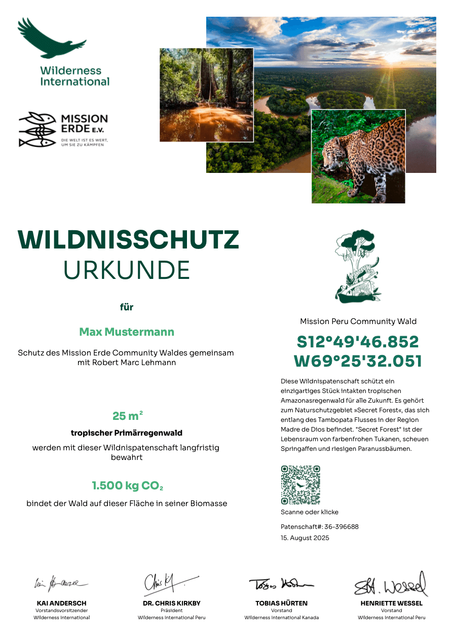 En agosto de 2021, Robert y su equipo visitaron por primera vez las áreas protegidas de Wilderness International en la Amazonia peruana, en uno de los lugares con mayor biodiversidad del planeta: la región de Madre de Dios. La vista sobre el dosel de la selva, los transectos caimanes nocturnos y el descubrimiento de los animales más raros de la selva peruana... Robert y su equipo no tardaron en darse cuenta de que este hábitat único necesitaba protección, ¡para siempre! Y eso fue sólo el principio de muchas misiones conjuntas entre la organización, Mission Erde e.V. y la mejor comunidad del mundo.