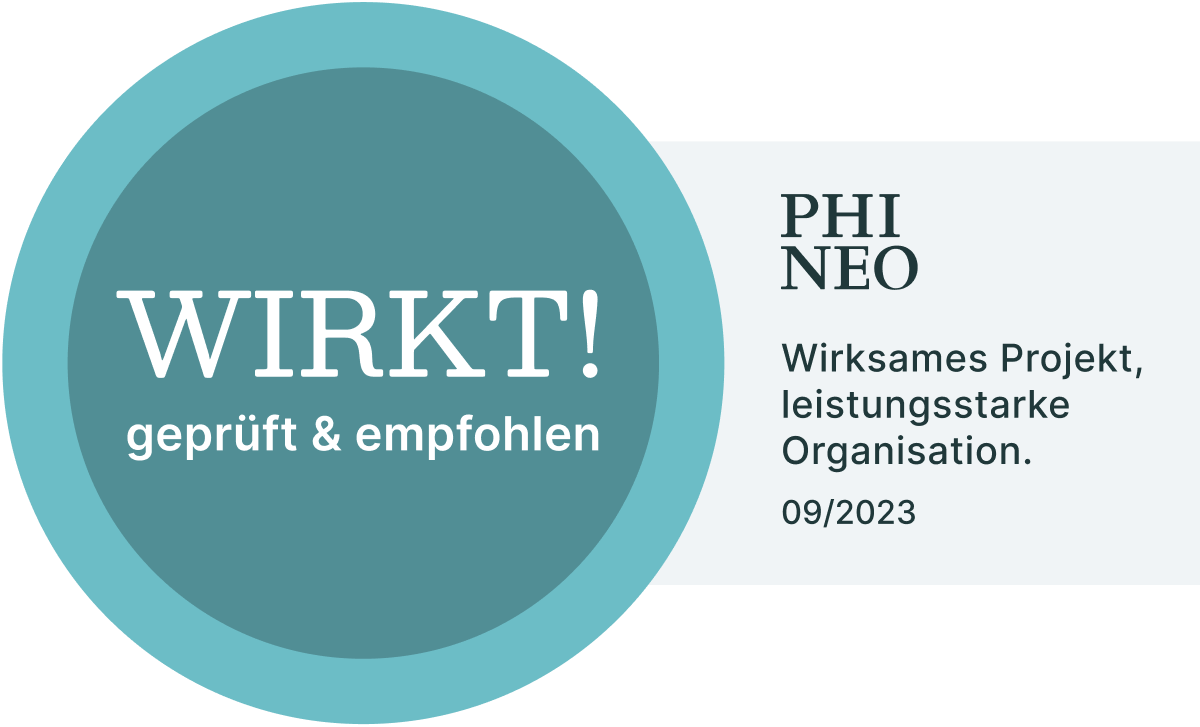 El sello "Wirkt!" de Phineo confirma que nuestro trabajo tiene un efecto rastreable y que somos una organización transparente y de alto rendimiento.