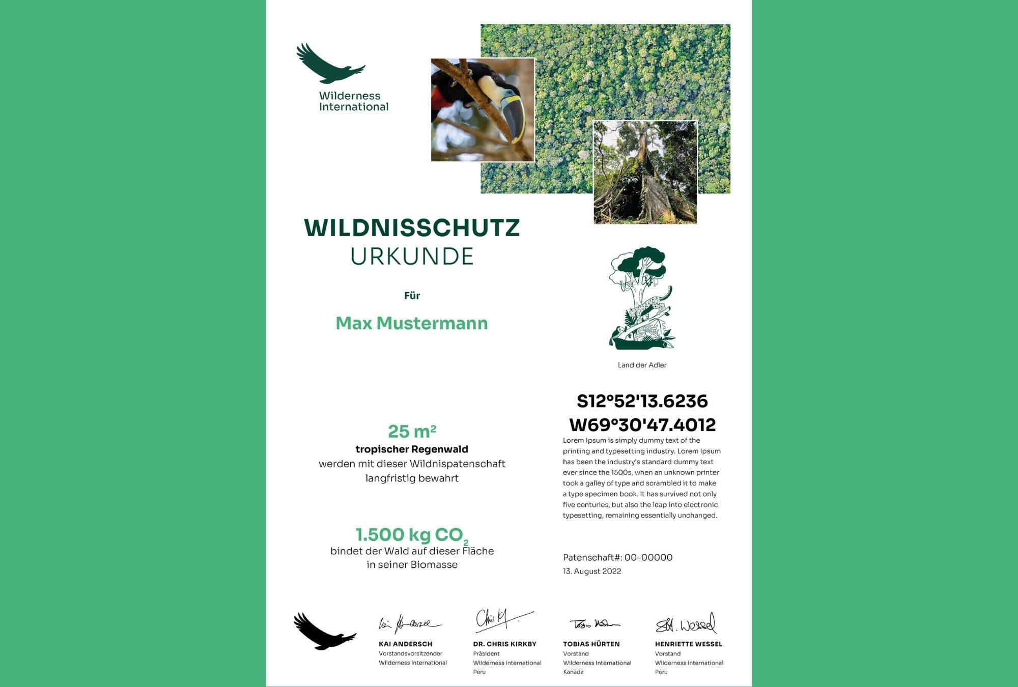 Personalizado, concreto, con un diseño atractivo: Recibirá un certificado de donación personalizado con las geocoordenadas exactas y una foto aérea de la zona forestal protegida.