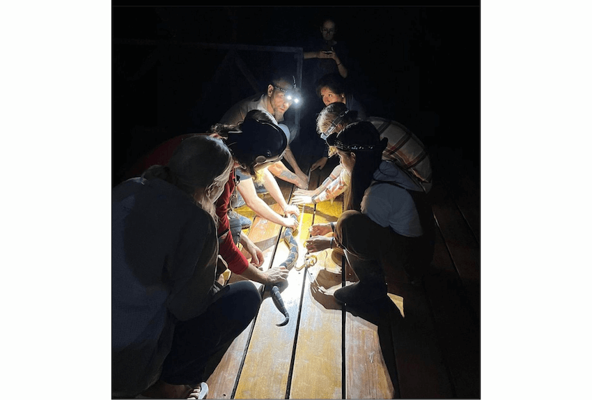 Verdadero trabajo en equipo: Xiomara y Danae junto a Chris Ketola y otros investigadores midiendo una serpiente.